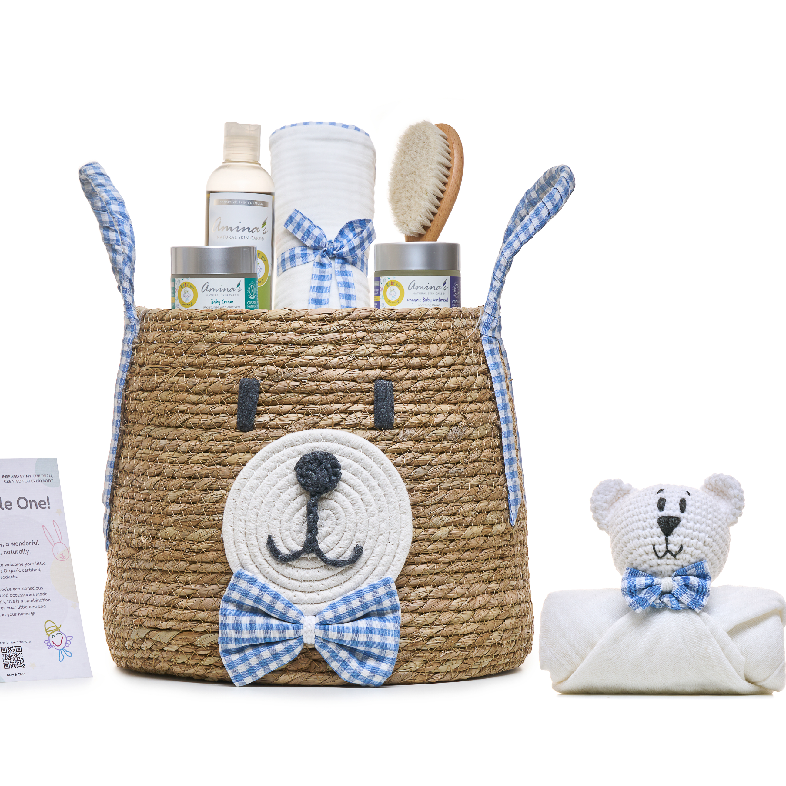 Hello Baby! A beautiful beginning, naturally. Welcome a little one with a range of Amina’s organic baby care products, thoughtfully presented in an adorable bespoke, eco-conscious bear basket. Paired with a selection of handcrafted accessories, this bundle is designed to delight — a perfect addition to any nursery, and a heartfelt gift for new parents. Whether for your own baby or someone special, it’s the ultimate newborn treat.