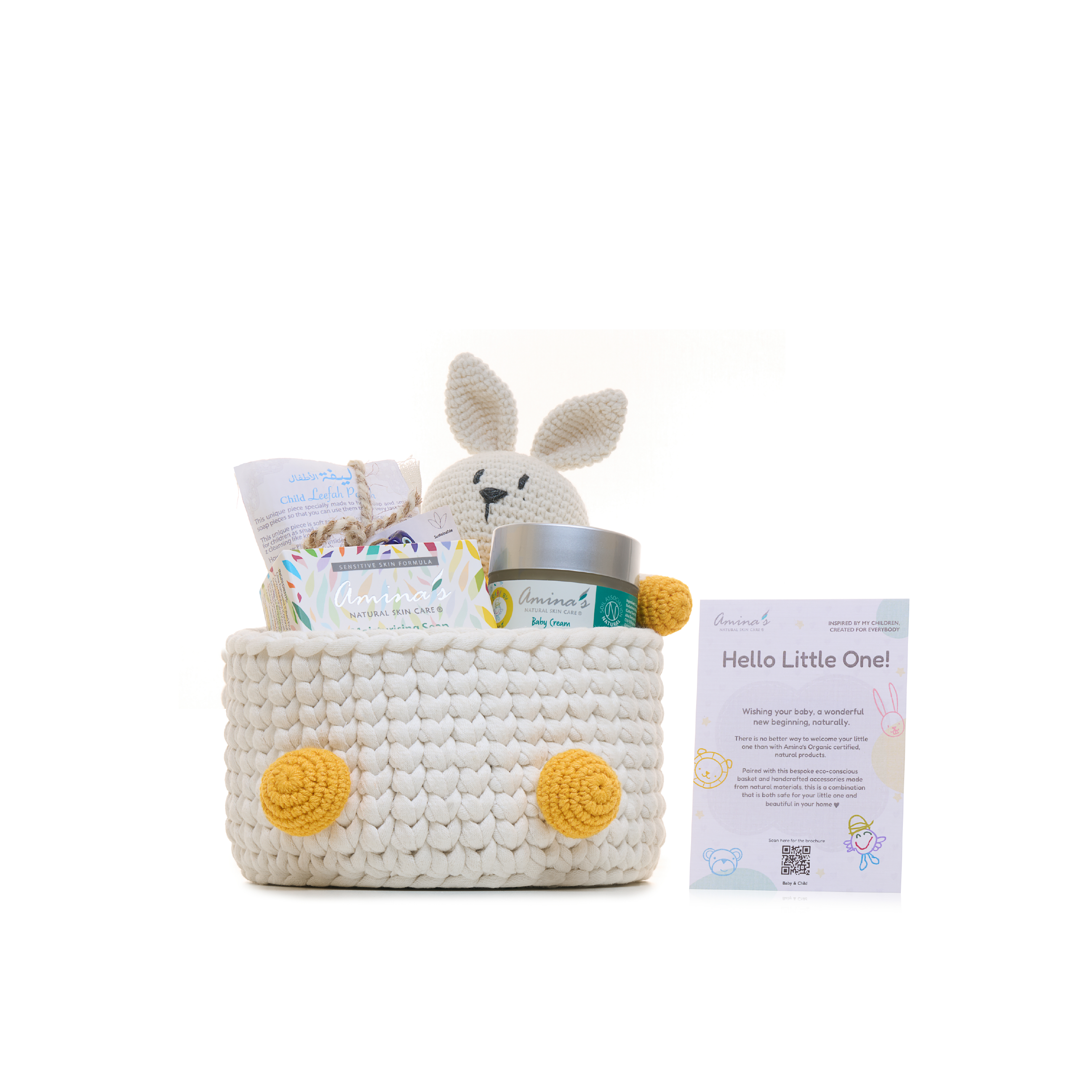 Bright and cheerful in a hand-crocheted yellow basket, this sweet trio is made for gentle bath time moments. Featuring our all-natural Baby Soap and soothing Aloe Vera Cream, plus a soft, hand-crocheted cotton Baby Leefah – perfect for delicate skin. A simple, sunny gift full of softness and care.